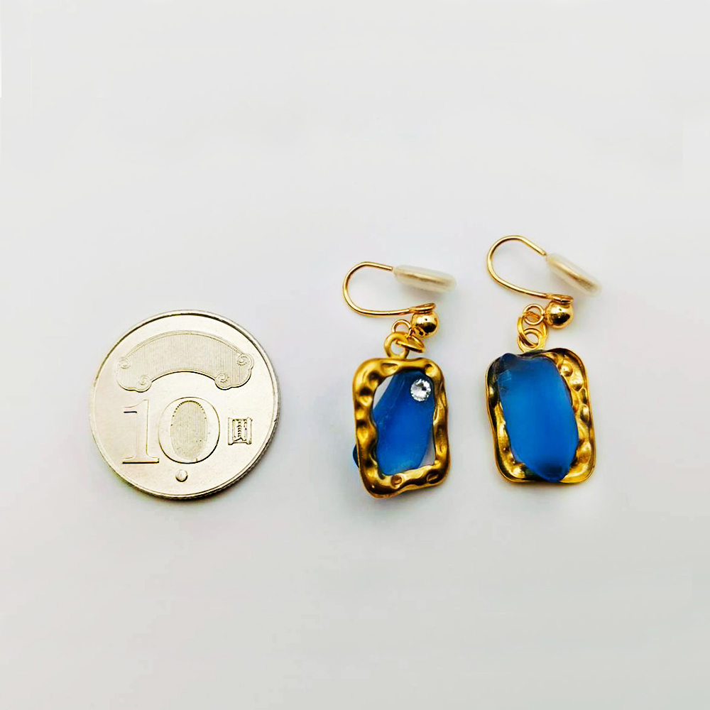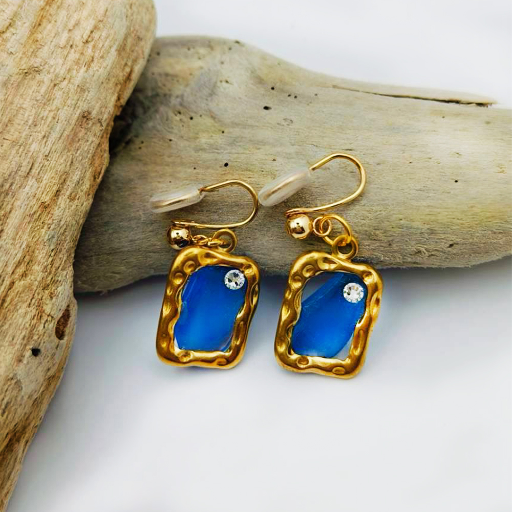 嚴選天然深藍海玻璃,搭配精緻金色造型框,每對耳環獨一無二。尺寸約2~2.5公分內(不含耳鉤)。