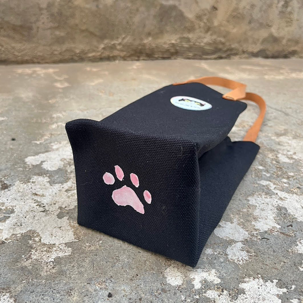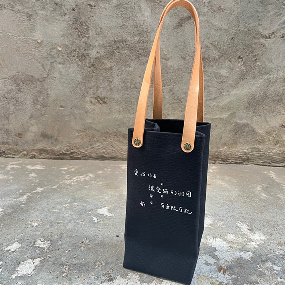 納茲貓品牌Logo與標語「愛貓行者,讓愛貓的迴圈有無限的可能∞」熱轉印燙製於包袋上,加上牛皮手把提帶。
