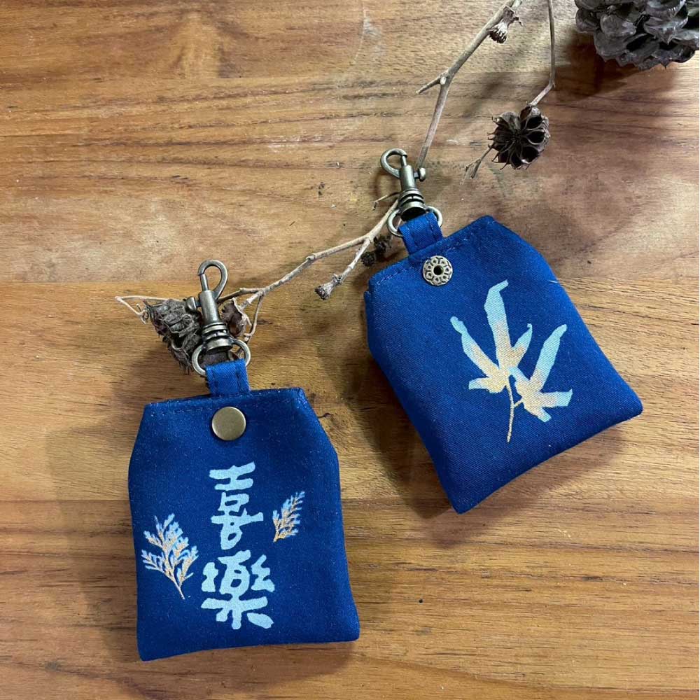 則沿襲香火袋的喜樂、順心、納福、平安、高中,再做變化,做小尺寸的平安符袋,只能收入一個香火袋。 藍曬每次製作過程,花草皆不同,所以都是驚喜喔~